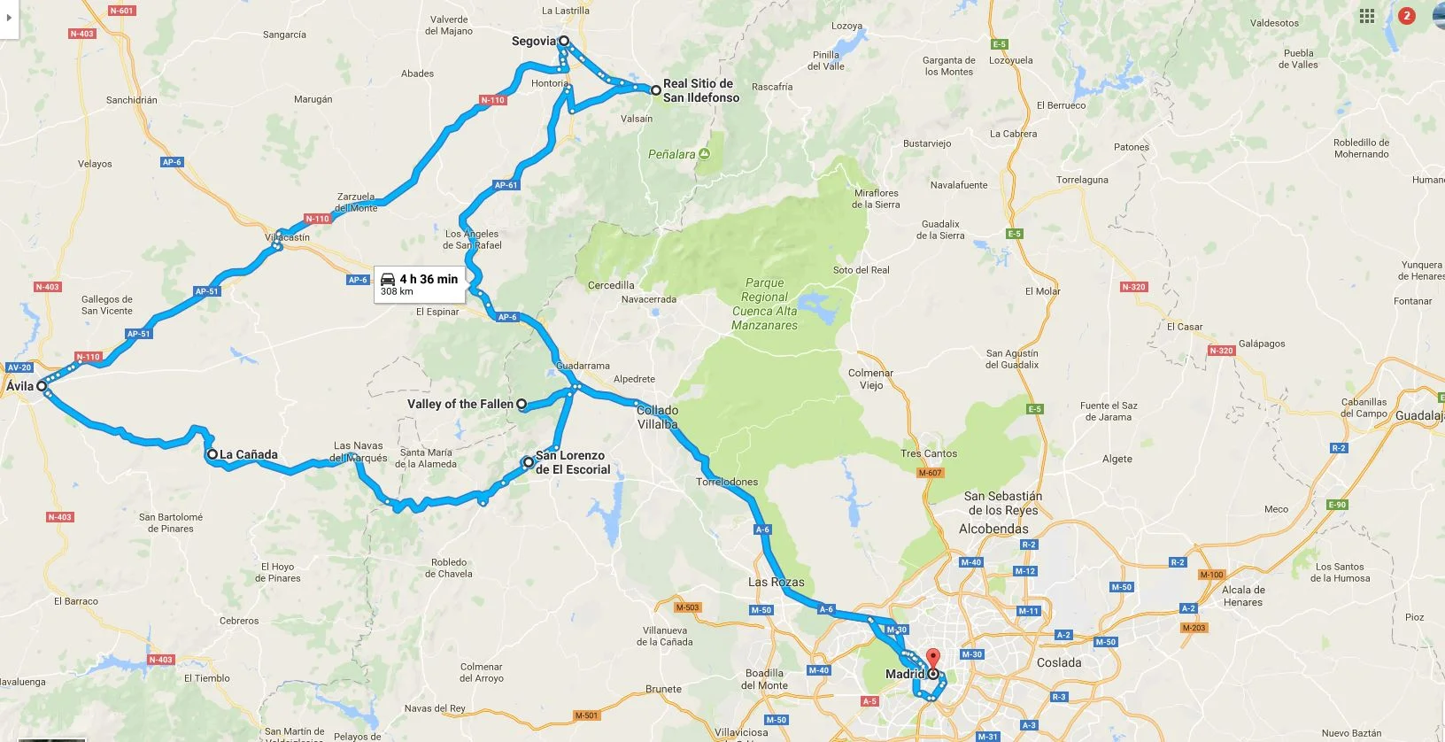 Leaving Real Sitio de San Ildefonso head back up CL-601 to N-603 and turn right. And then join the AP-61 and head back to Madrid.